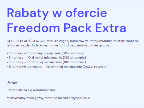 Każdy Twój kolejny numer w Premium Mobile to 5 zł mniej na fakturze co miesiąc, przez cały czas trwania umowy.